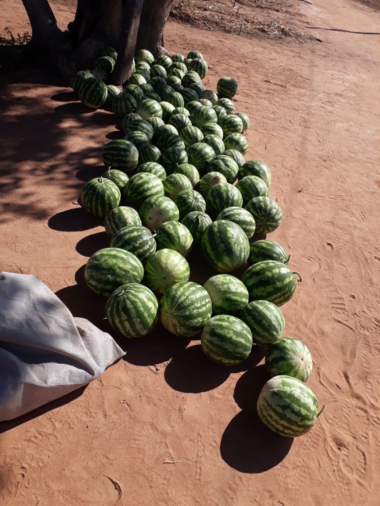 Após a chegada dos kits produtivos, contendo sementes, mangueiras, fitas de gotejamento e telas, a Associação dos Moradores da Fazenda Caraíbas avançou na produção de frutas e verduras, especialmente na produção de melancias, que têm abastecido feiras pela região.