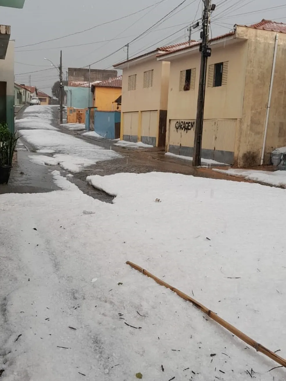 O granizo também deixou ruas de Itaú de Minas cobertas de gelo durante a chuva desta terça-feira.